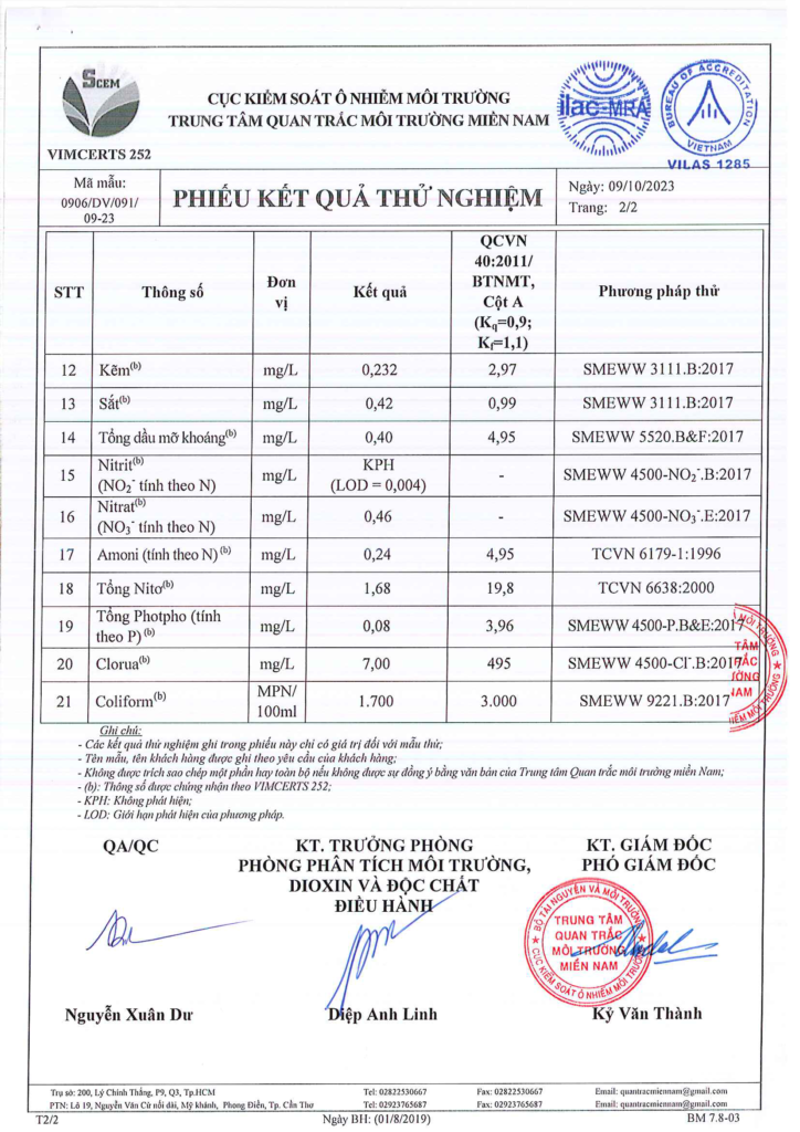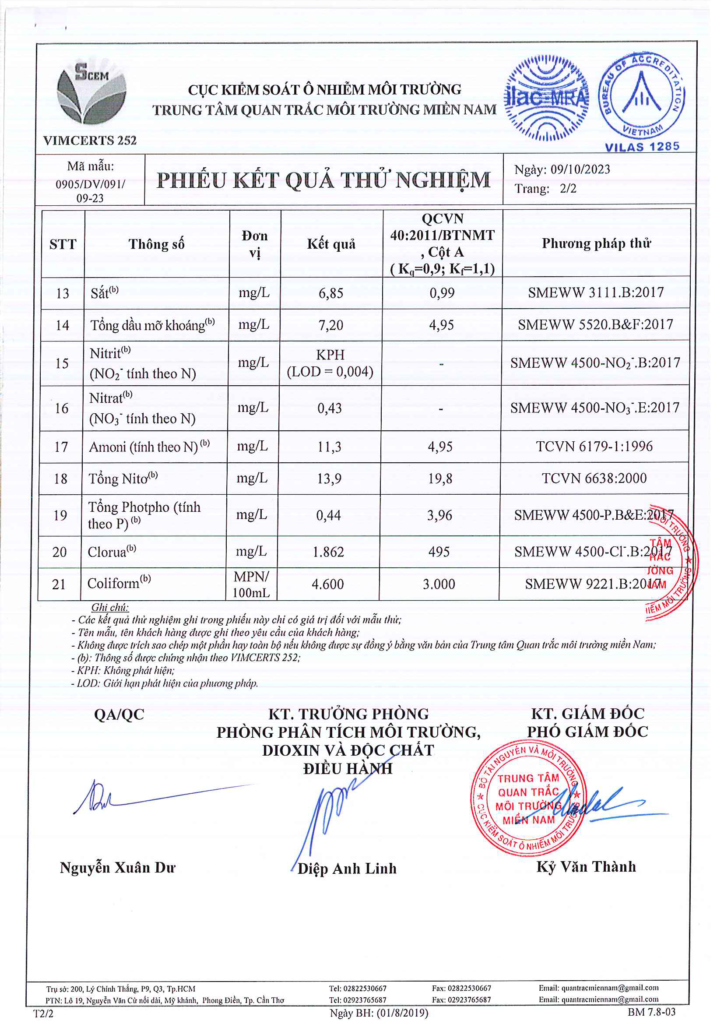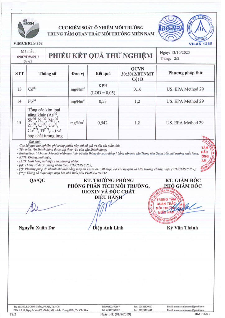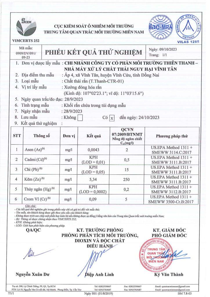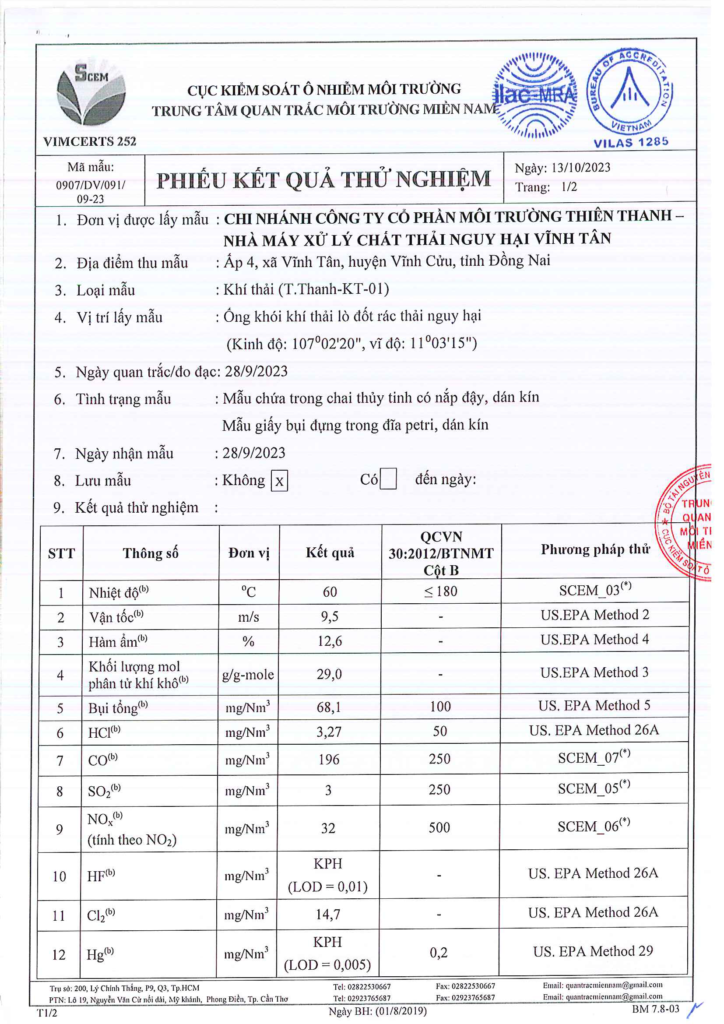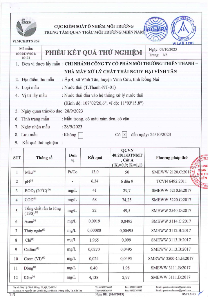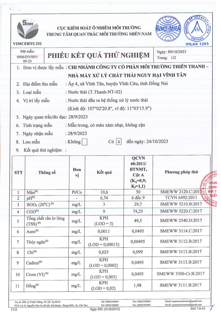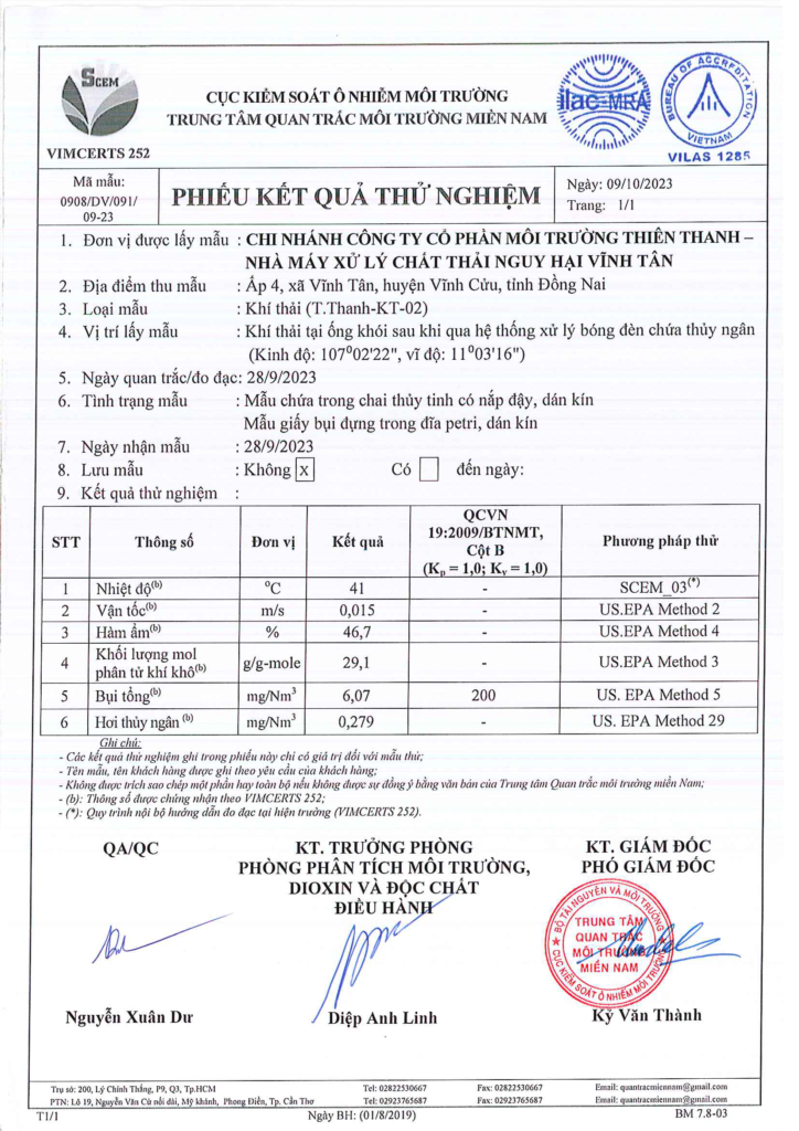 Kết quả quan trắc môi trường năm 2023 đối với các nguồn thải phát sinh tại Nhà máy xử lý chất thải Vĩnh Tân.